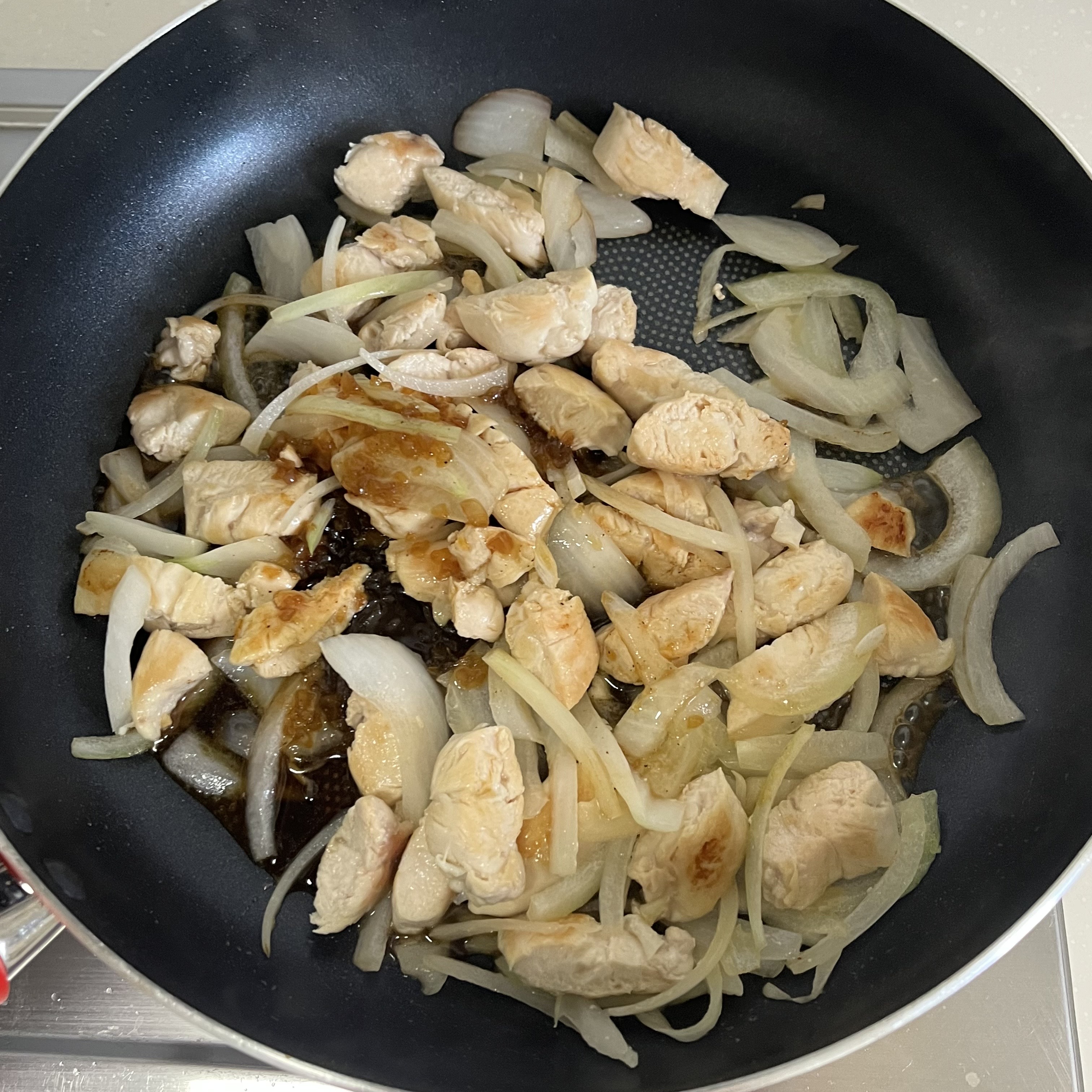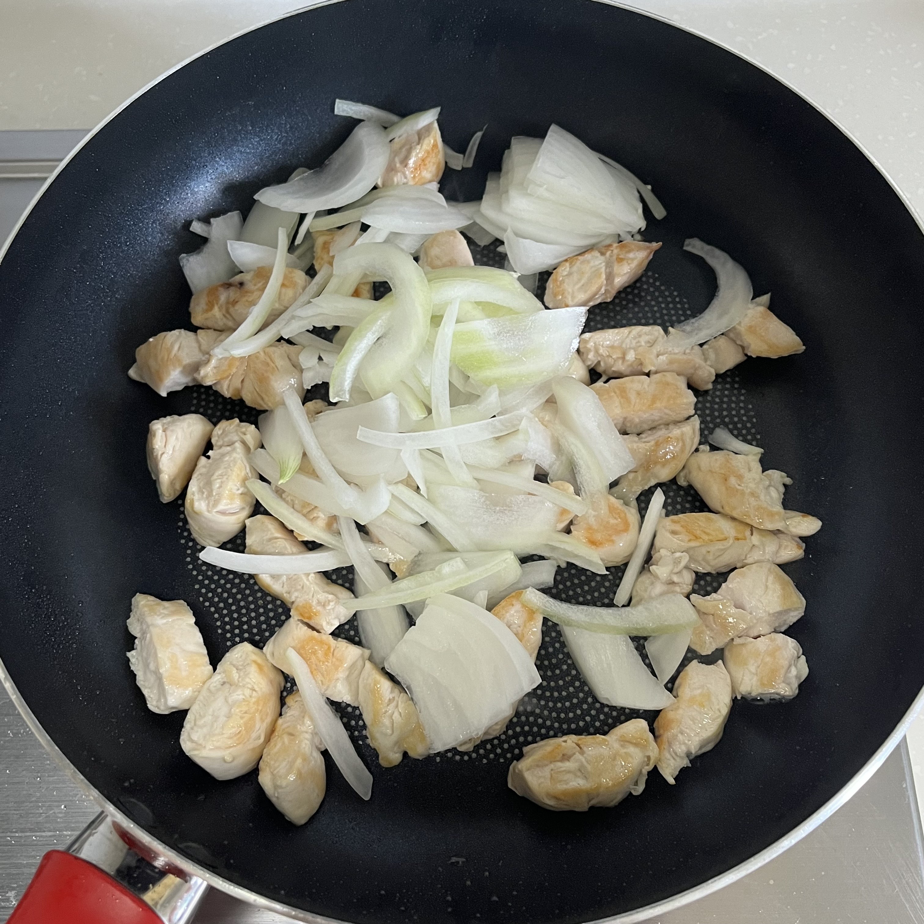 3. 닭이 익으면 양파를 넣고 함께 볶아주세요.