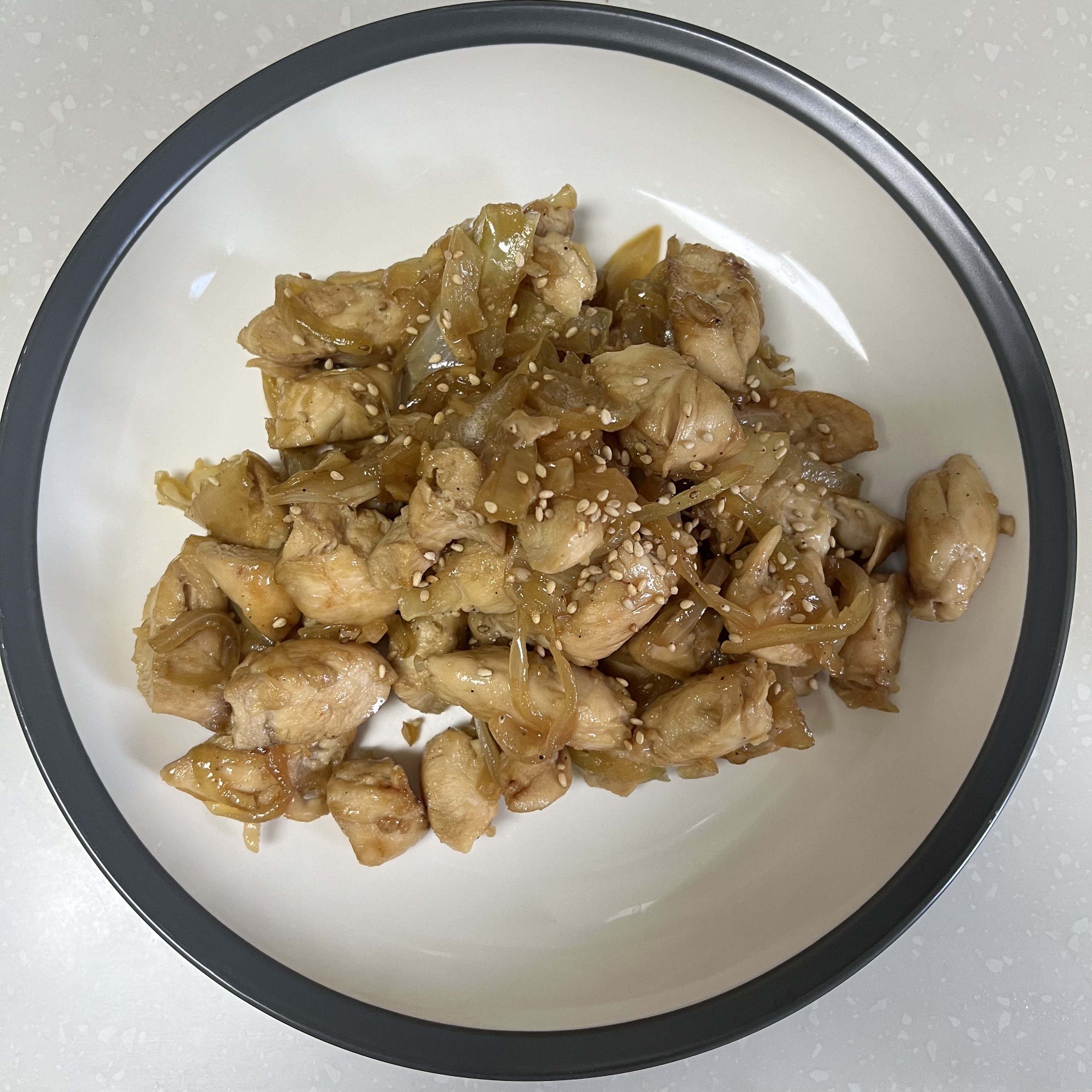 닭안심 300g, 양파 1/4개, 다진마늘 0.5T, 간장 3T, 설탕 2T, 참기름 1T, 후추 톡톡, 물 50ml, 통깨