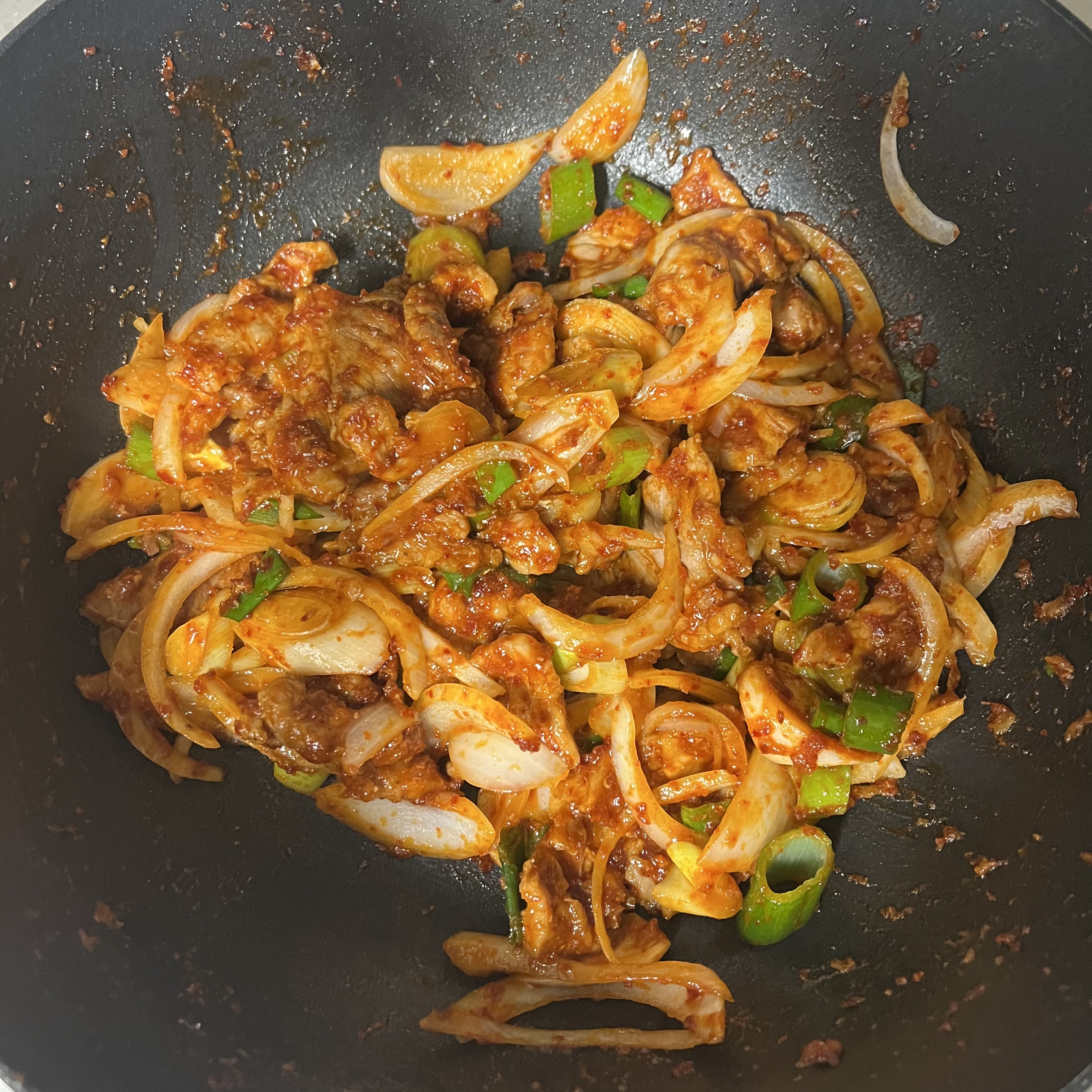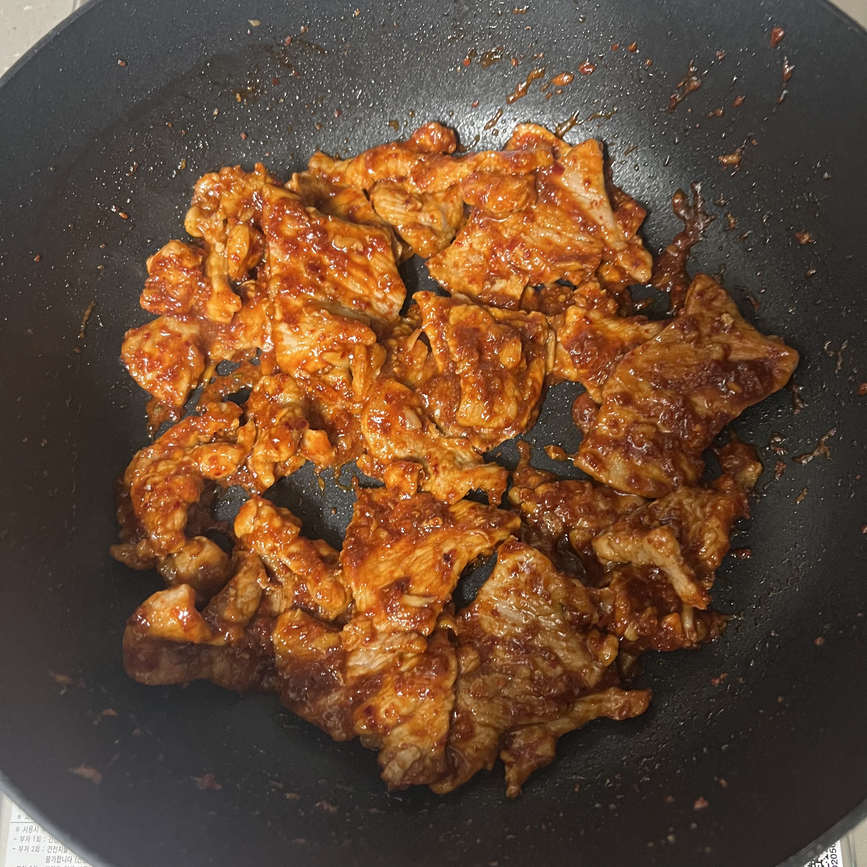 5. 고기가 익으면 양념장을 넣고 함께 볶아주세요.