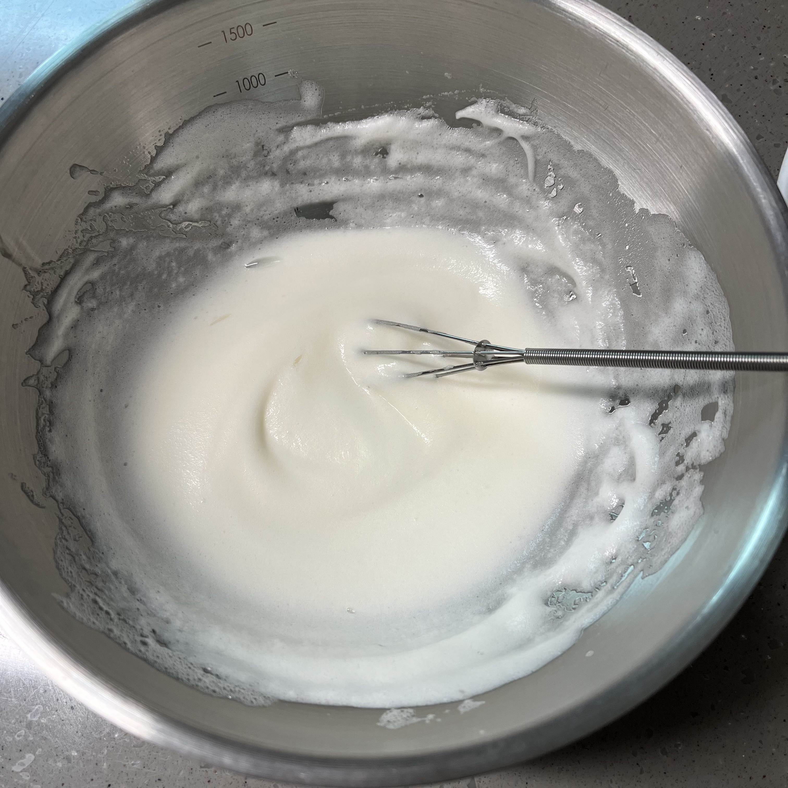 따로 분리해둔 계란 흰자는 휘핑기로 머랭을 만들어줍니다