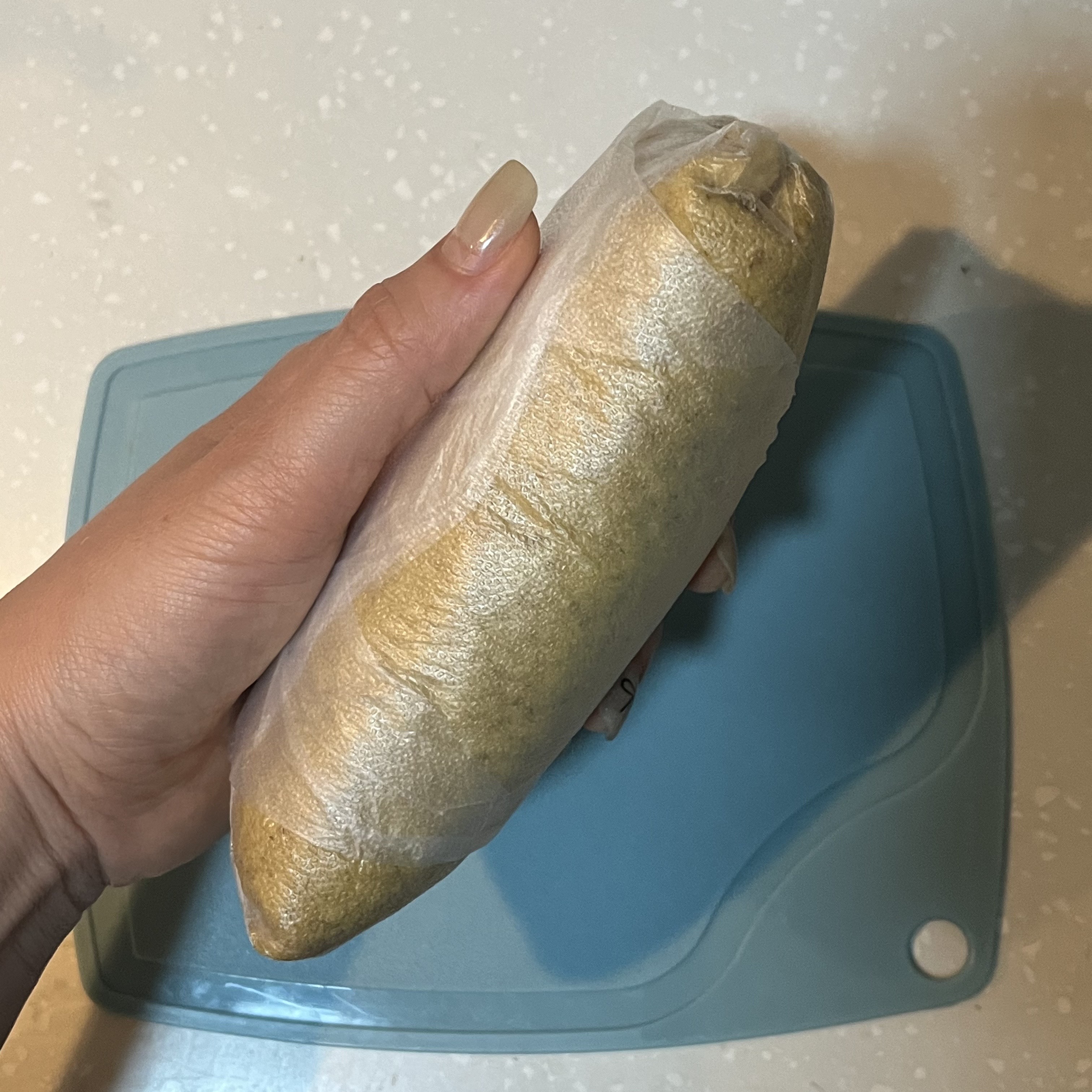 6. 또띠아롤을 아래서부터 잘 말아주고, 매직랩을 아래->왼쪽->오른쪽->위 방향으로 접어주면 깔끔하게 포장이 됩니다.