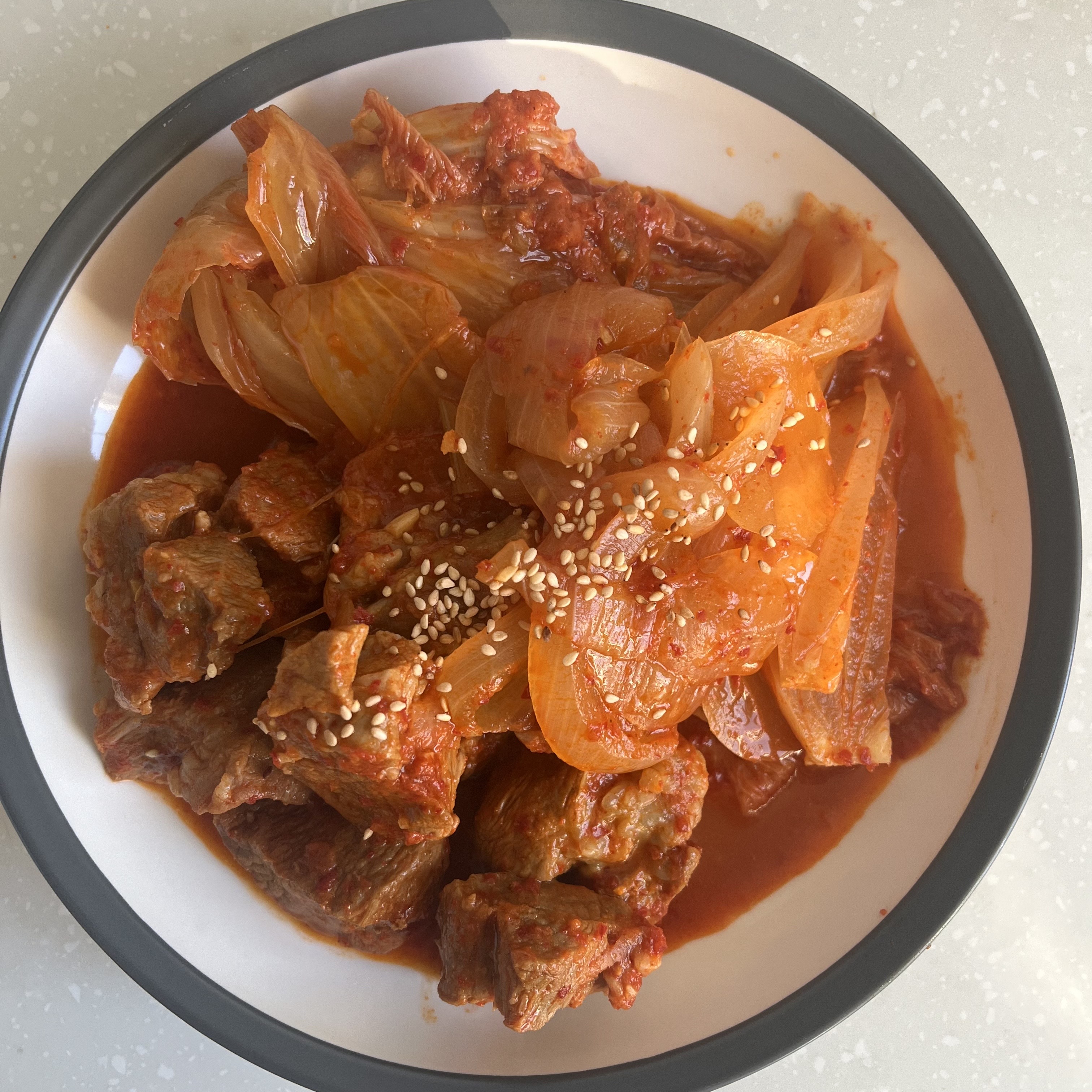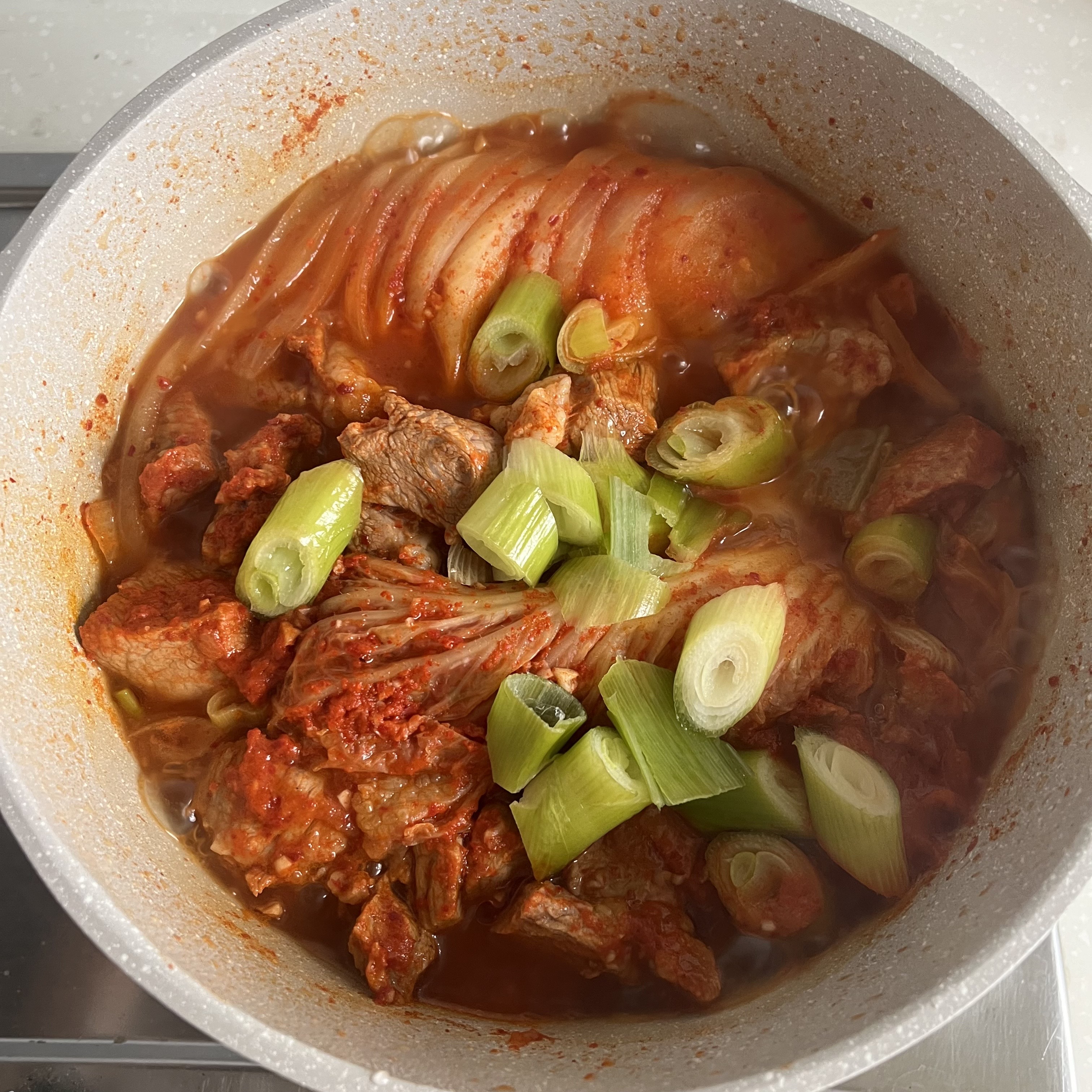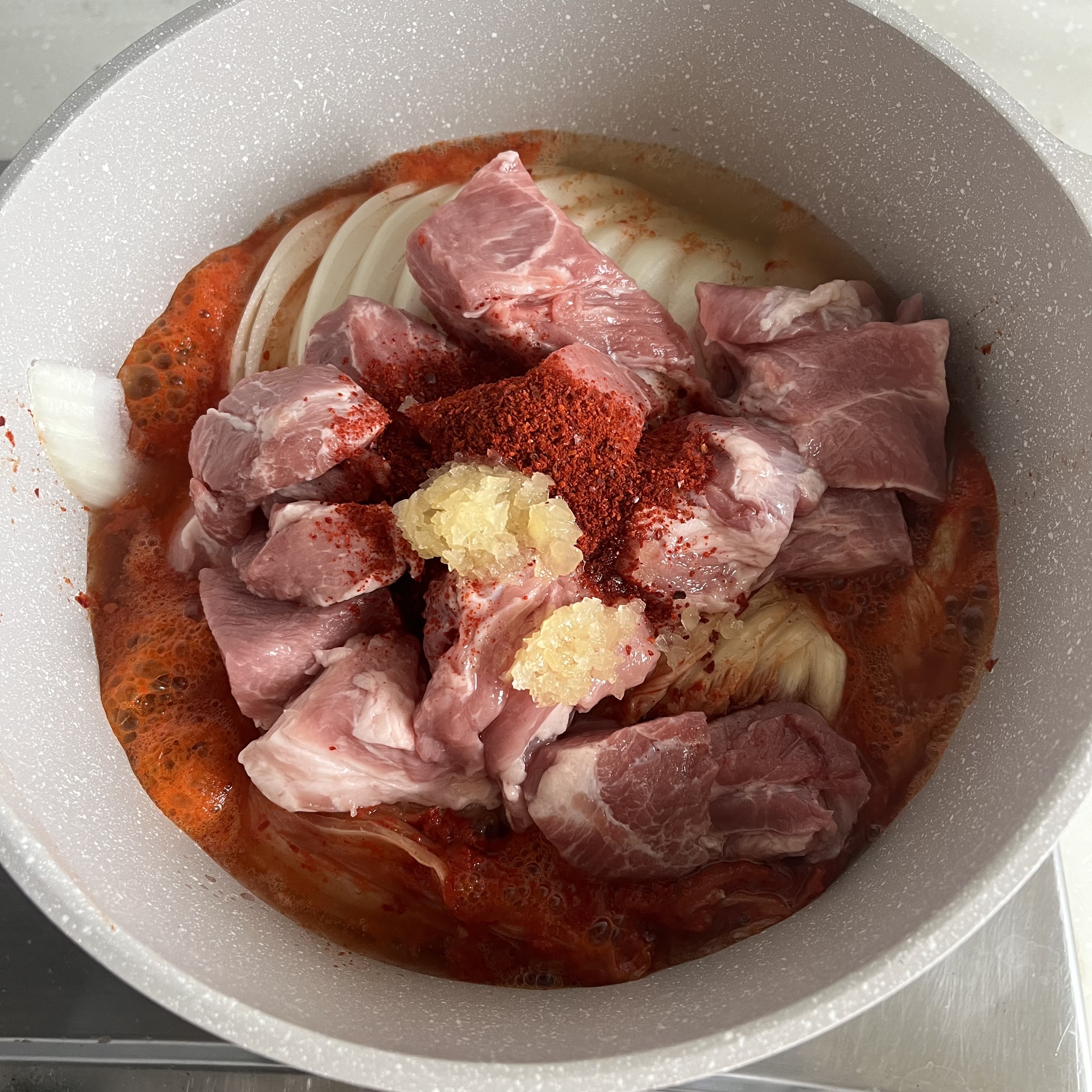 중약불에 끓여 고기에 양념이 배고, 고기와 김치가 푹 끓여져 부드러워요.