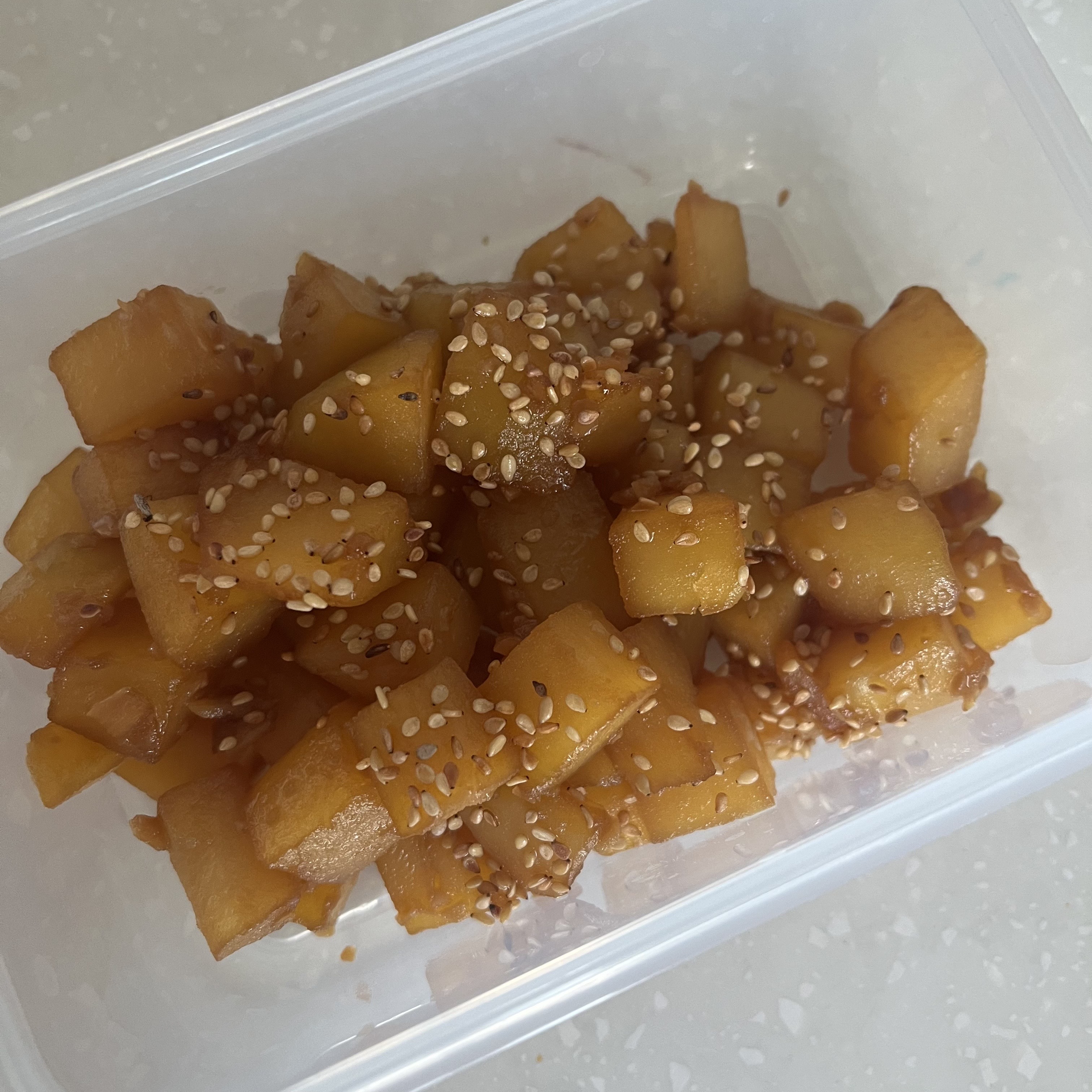 감자 중간 사이즈 2개, 올리고당 3T, 간장 3T, 식용유 0.5T, 마늘 0.5T, 참기름 0.5T, 참깨 조금