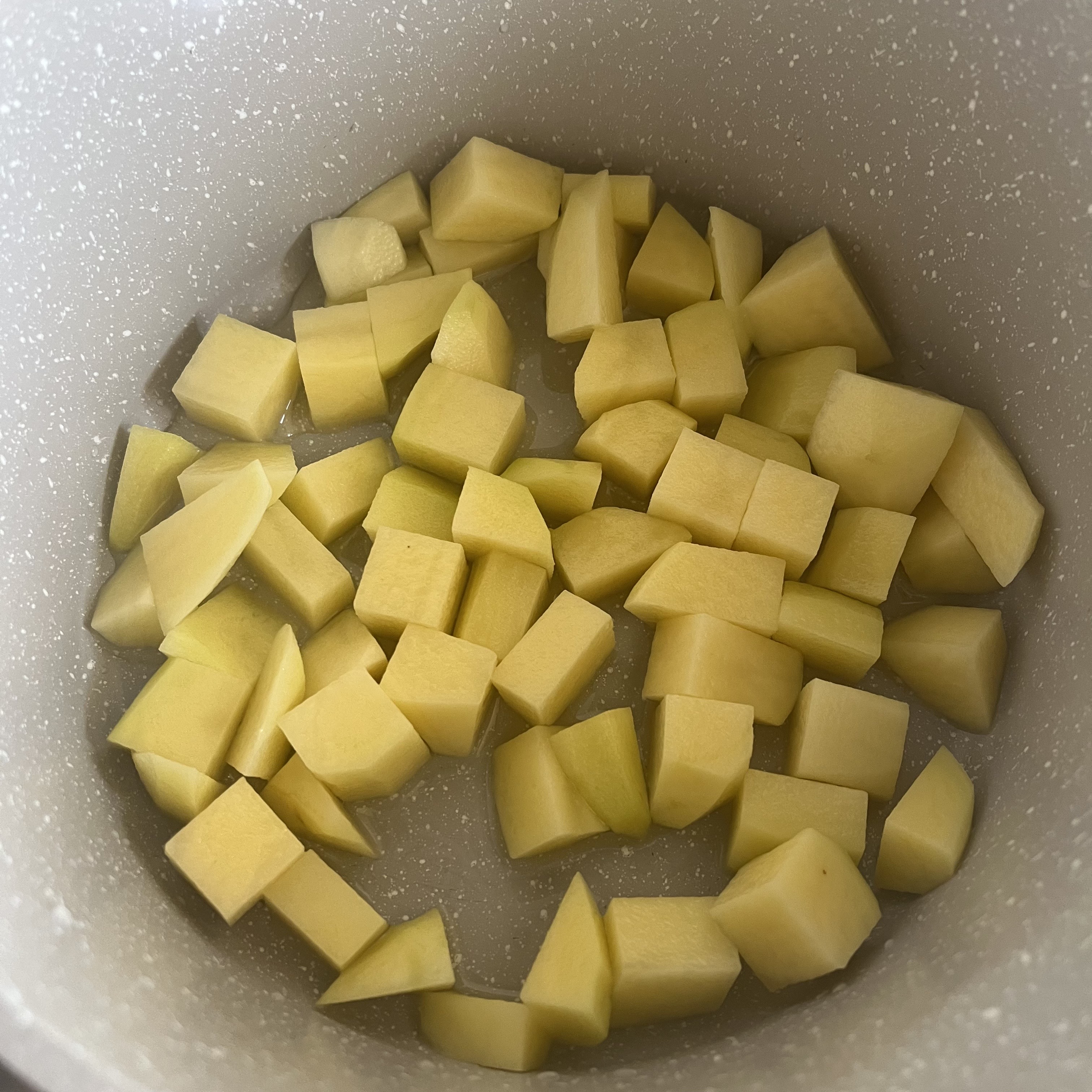 2. 감자는 적당한 사이즈로 깍뚝썰기 한 후 전분 제거를 위해 물에 잠시 담궈뒀다 물기를 제거해주세요.