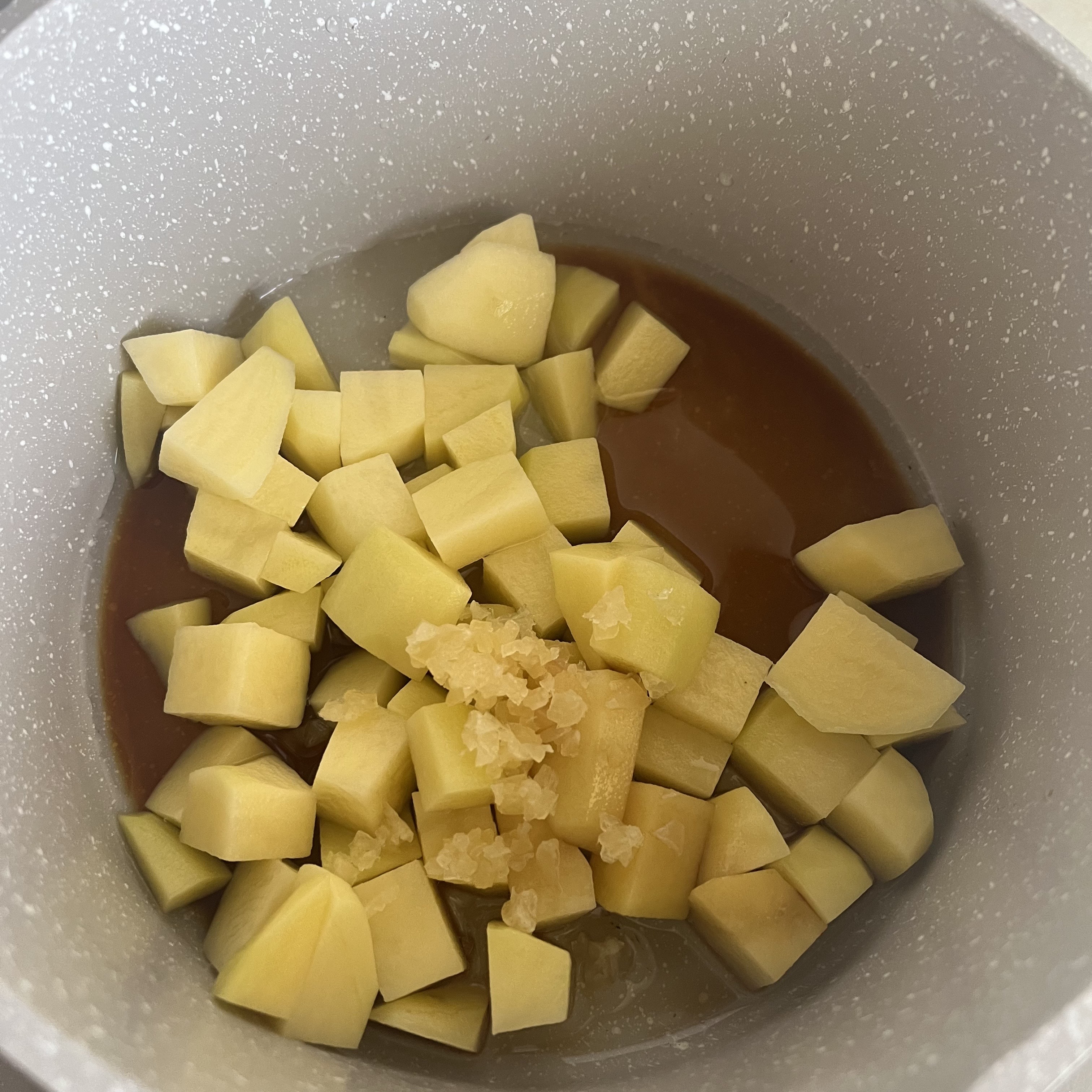 4. 감자에서 빠져나온 수분에다가 간장 3T, 식용유 0.5T, 마늘 0.5T, 참기름 0.5T를 넣고 섞어줍니다. 끓어오르면 중약불로 줄이고 냄비 뚜껑을 덮어 5-10분정도 감자가 익도록 조려줍니다.
