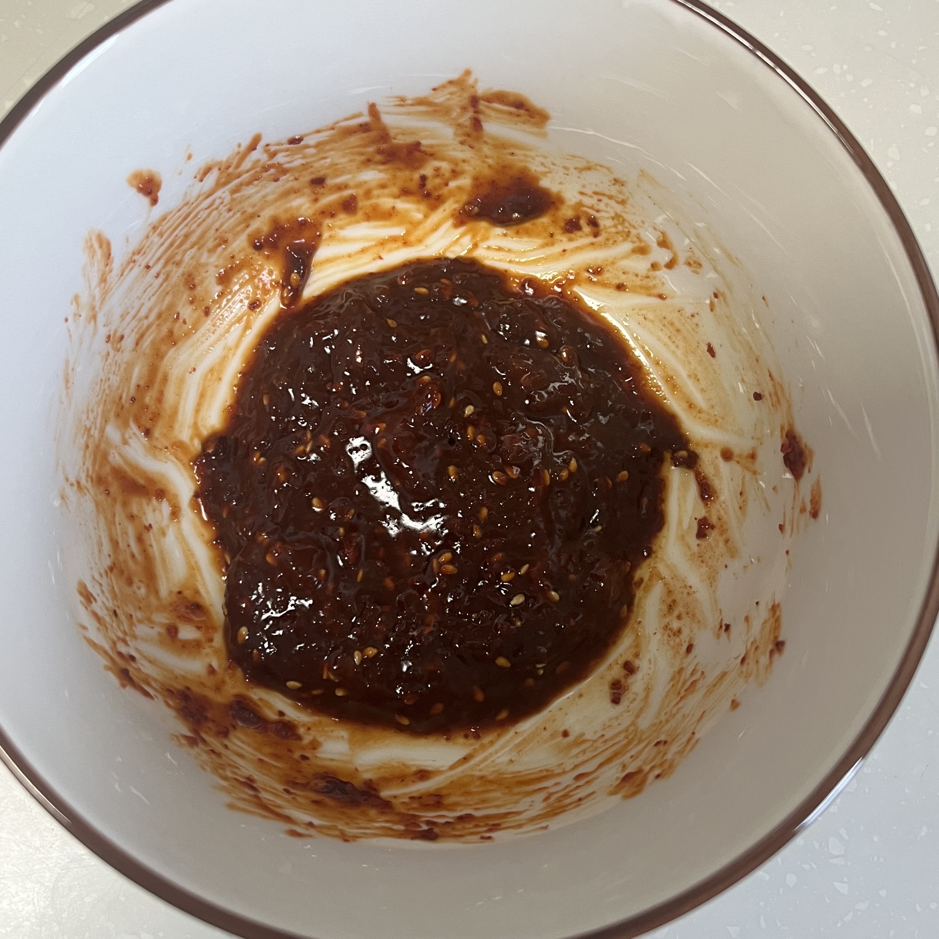 2. 고추장 1T, 고춧가루 1T, 설탕 1T, 간장 1T, 다진마늘 0.5T, 참기름 0.5T, 통깨를 넣고 잘 섞어 양념장을 만들어 줍니다.