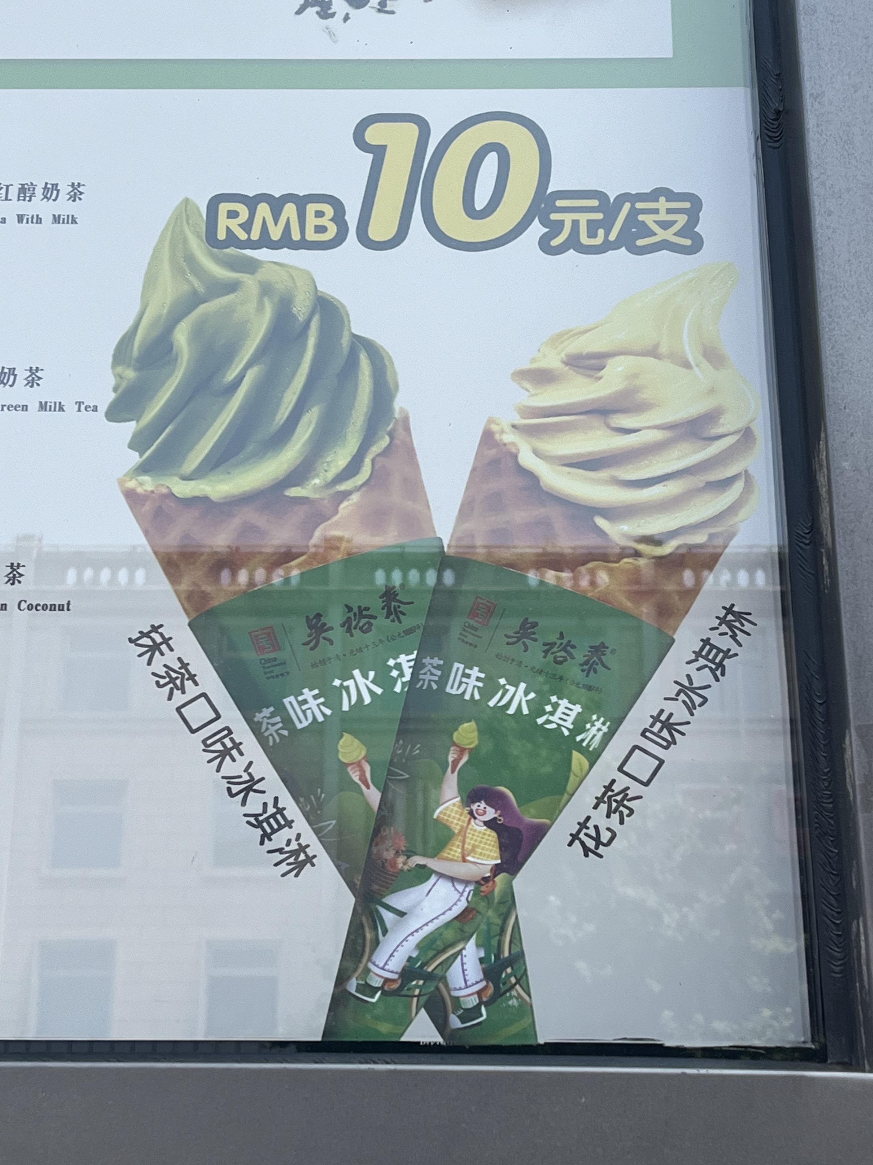 아이스크림은 말차맛과 자스민티맛이 있고, 가격은 개당 10위안 입니다.