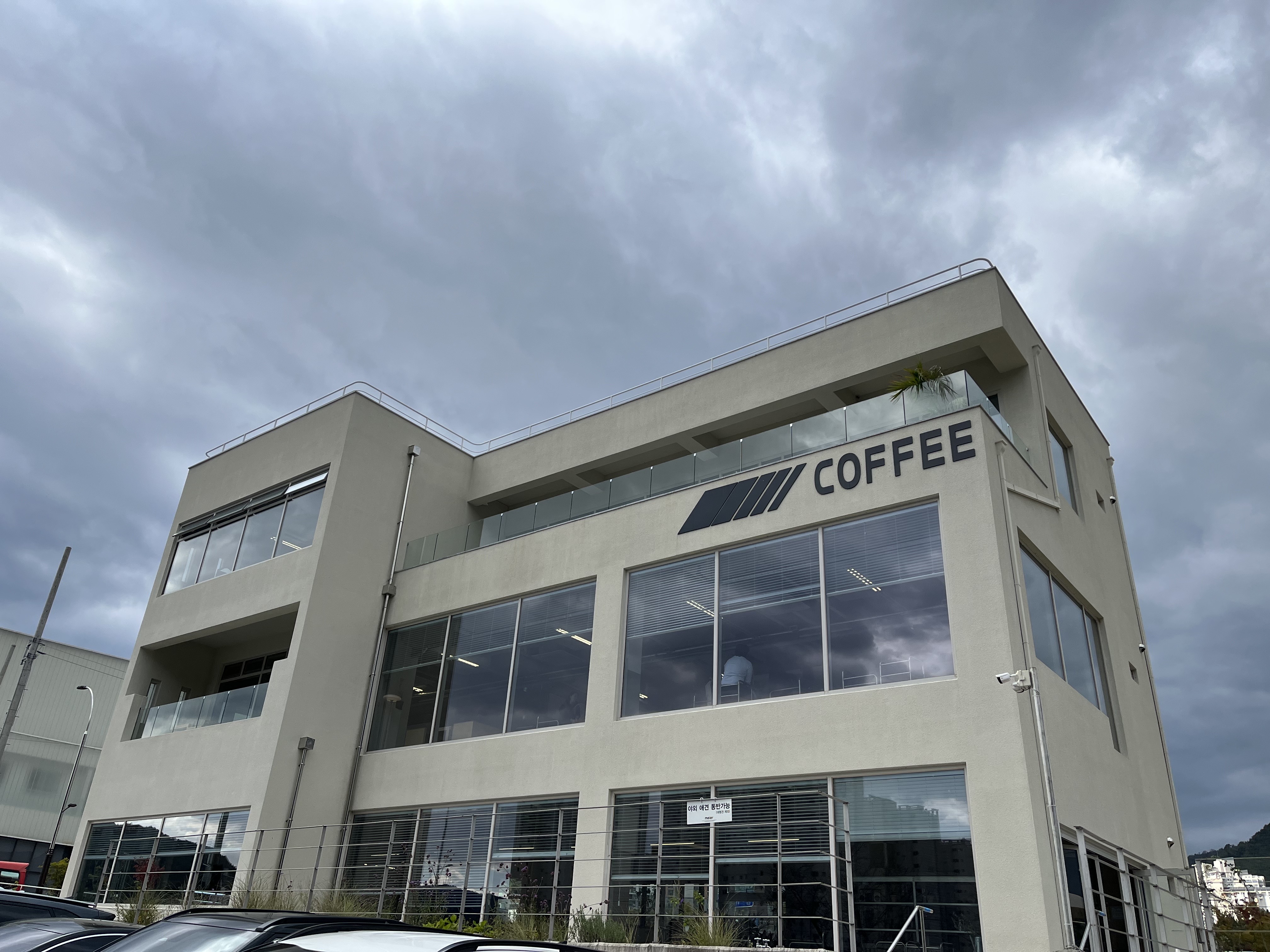 하얀색 3층 건물에 큰 통창이 있어 시원해 보였습니다.