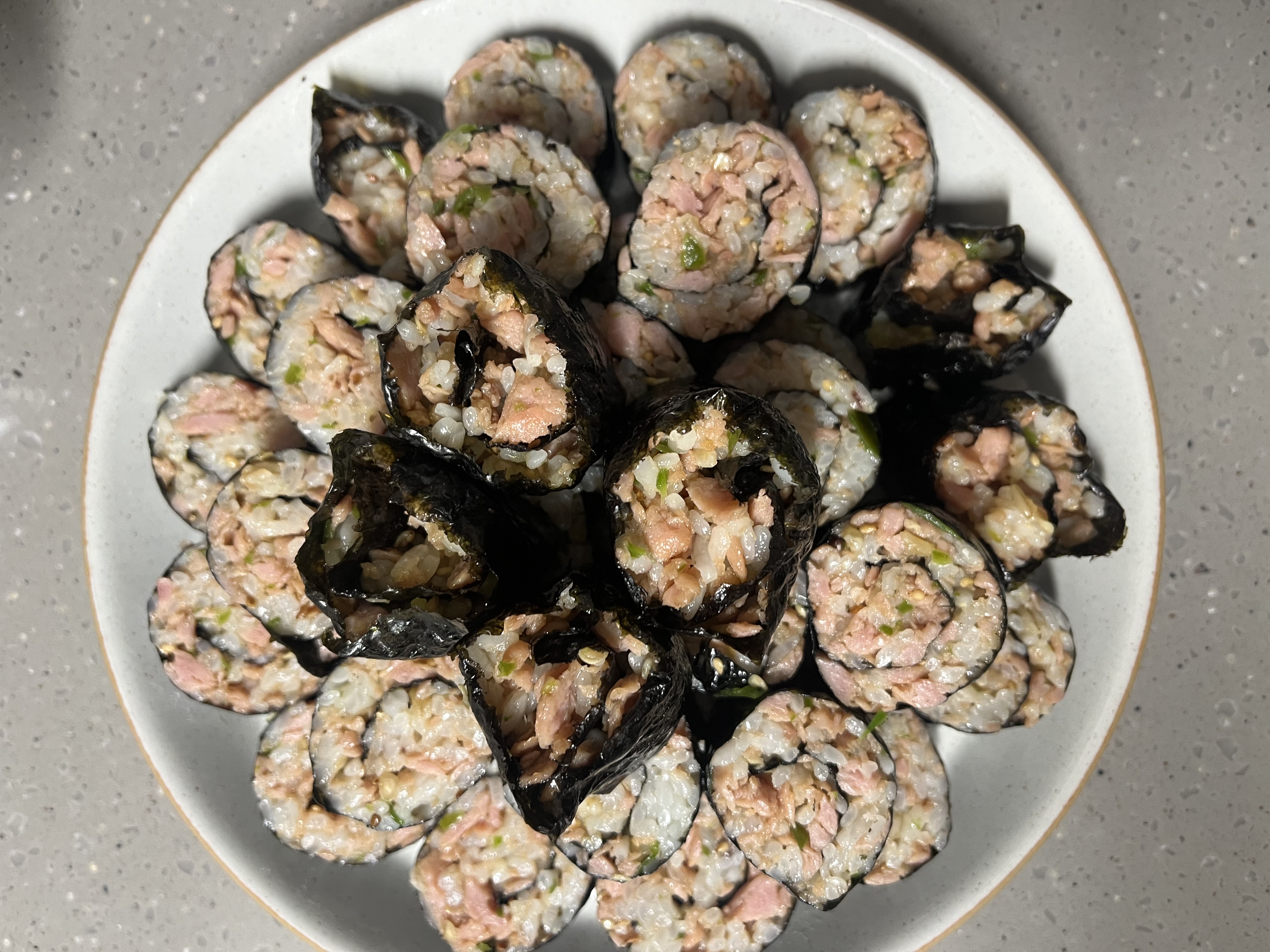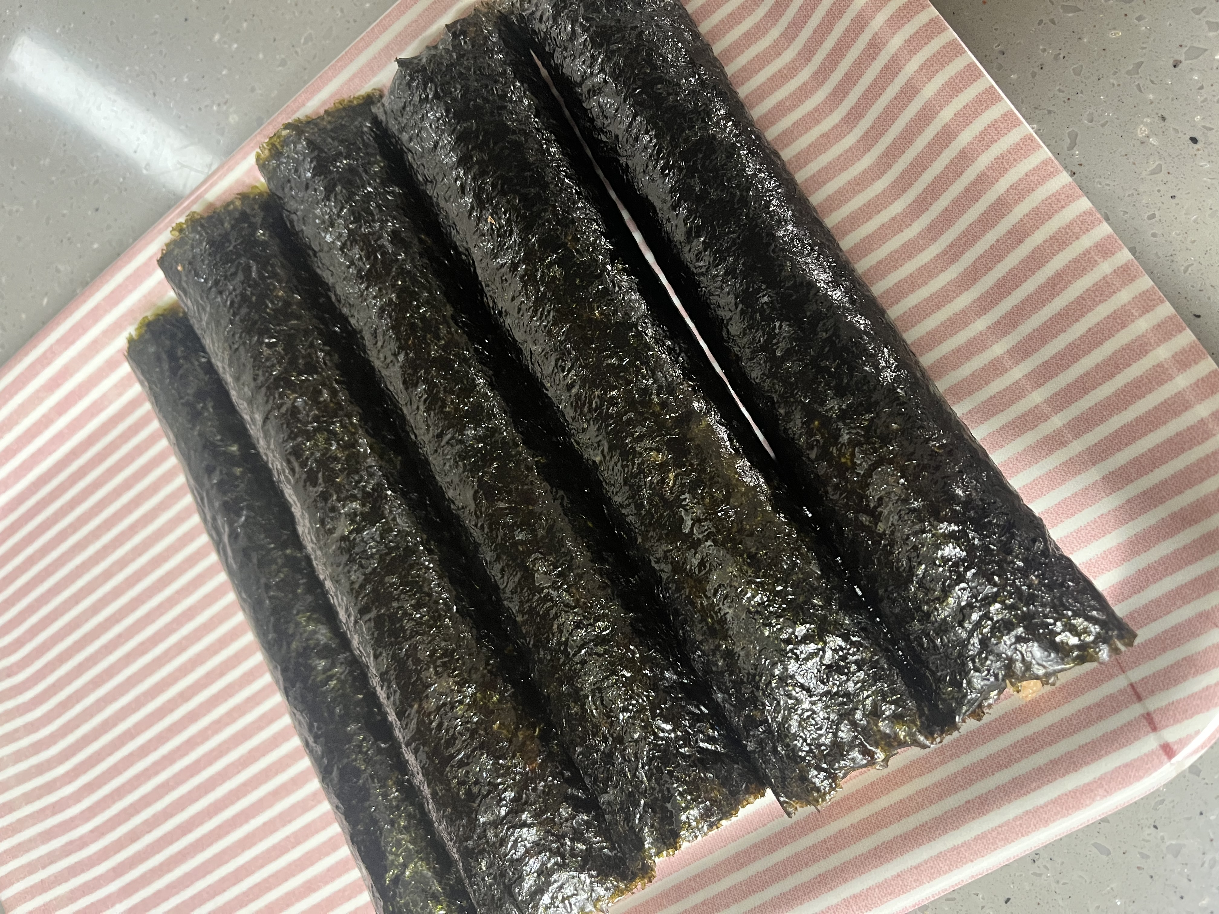 7. 이제 김위에 밥을 올려 돌돌 말아주면 완성입니다.