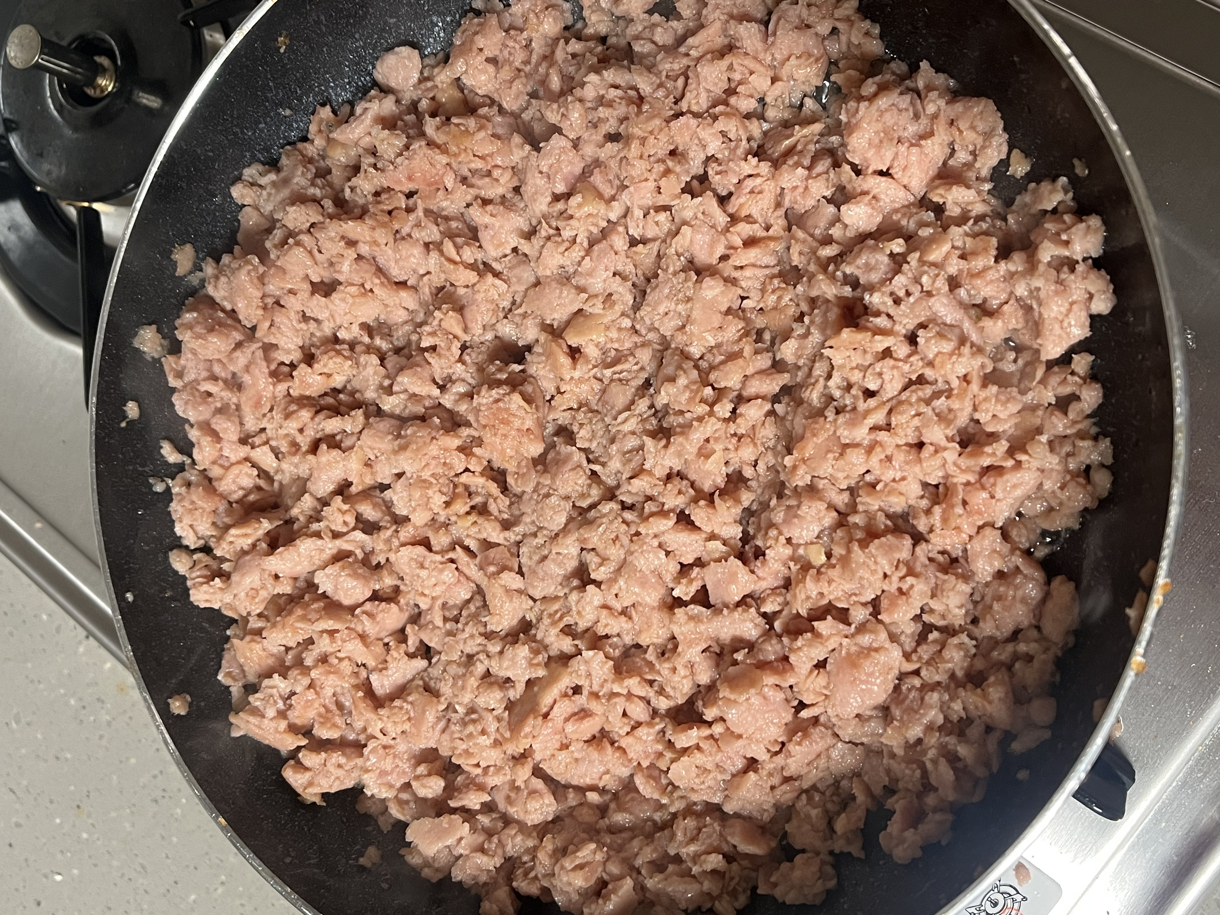 3. 프라이팬에 으깬 스팸을 올리고 기름이 나오고 약간 노릇해질때까지 볶아주세요