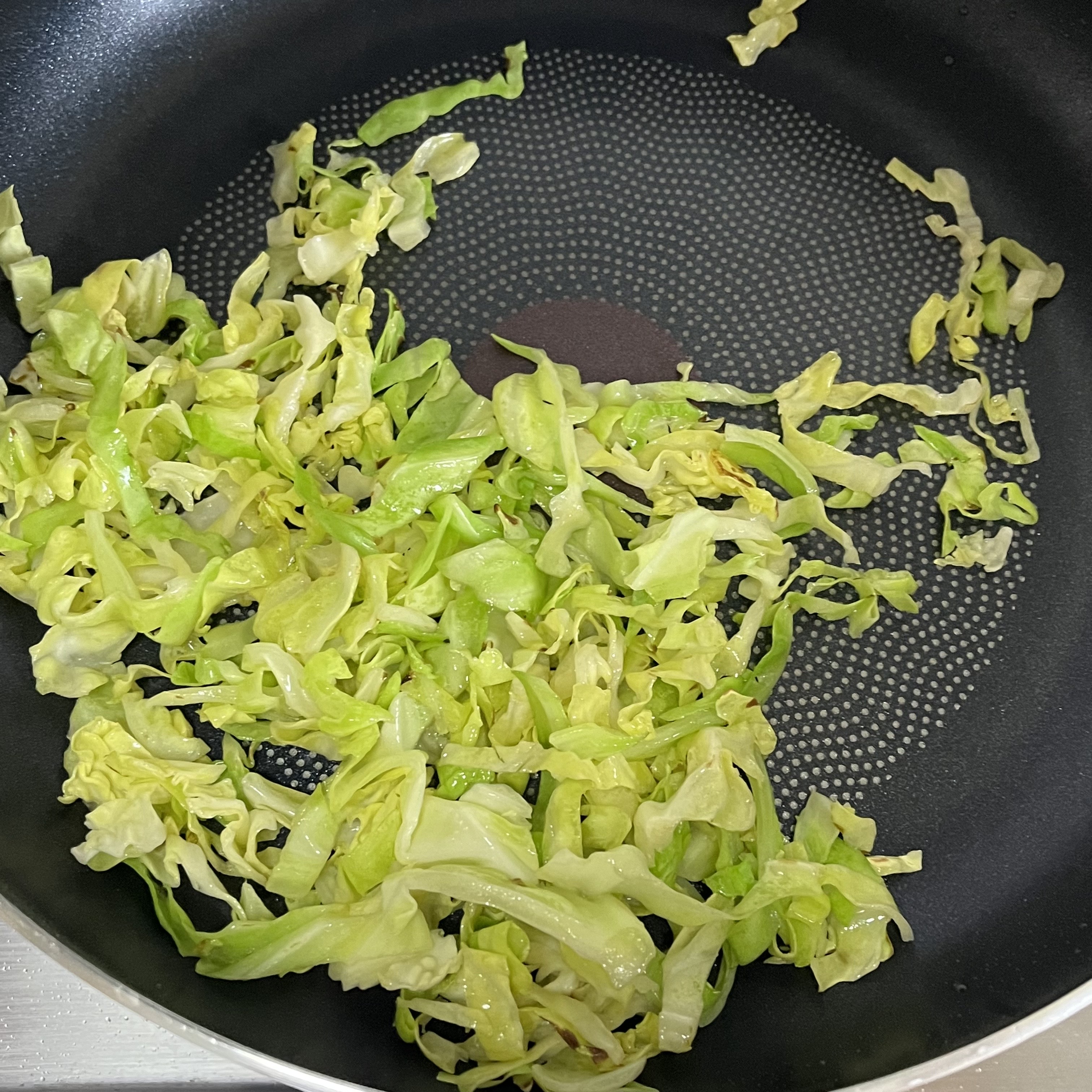 3. 채썬 양배추를 넣고 소금, 후춧가루를 약간 뿌리고 살짝 익혀주세요.