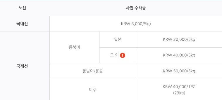 초과 수하물을 노선에 따라 kg당 추가요금이 적용됩니다.