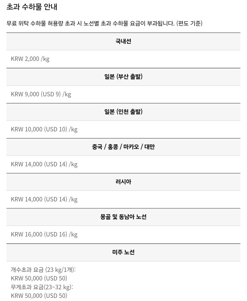 초과 수하물을 노선에 따라 kg당 추가요금이 적용됩니다.