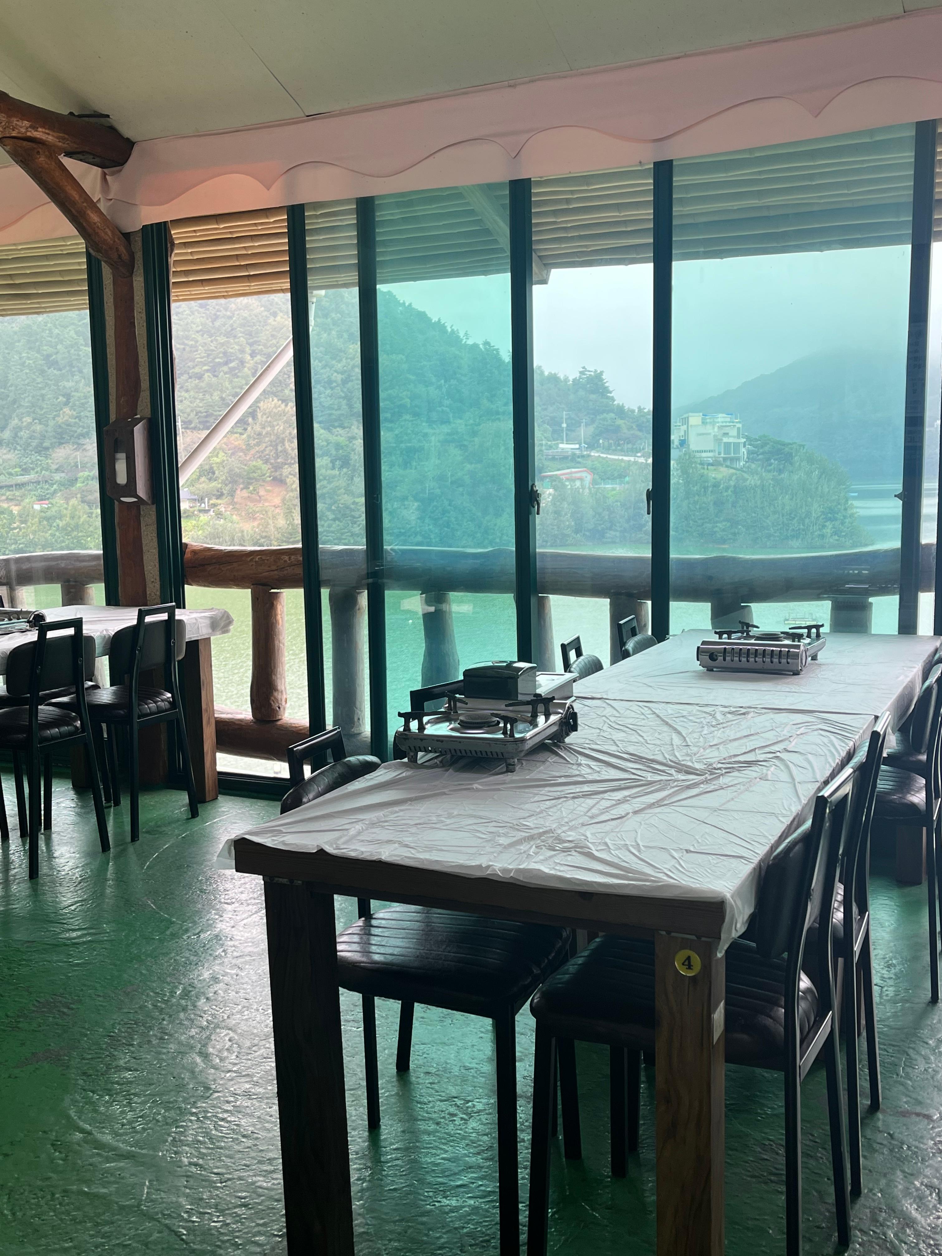 매장 안은 실내/실외 공간이 구분되어 있어서 다양한 테이블이 마련되어 있어요. 내부도 깔끔하고 정돈된 분위기였고, 특히 야외 테이블에서 바라보는 옥정호의 전경은 정말 말로 표현하기 어려울 만큼 멋졌습니다.