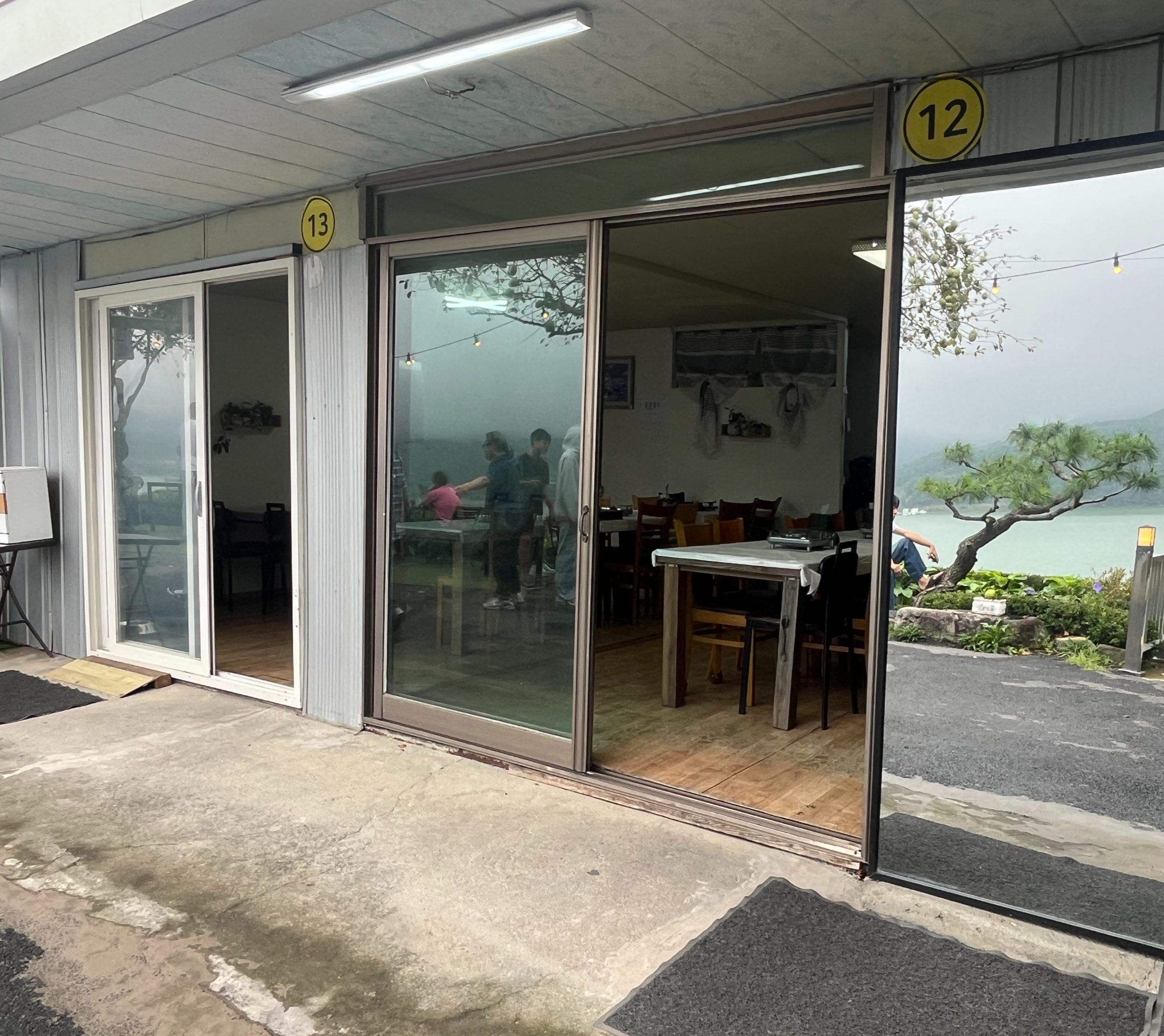 매장 안은 실내/실외 공간이 구분되어 있어서 다양한 테이블이 마련되어 있어요. 내부도 깔끔하고 정돈된 분위기였고, 특히 야외 테이블에서 바라보는 옥정호의 전경은 정말 말로 표현하기 어려울 만큼 멋졌습니다.