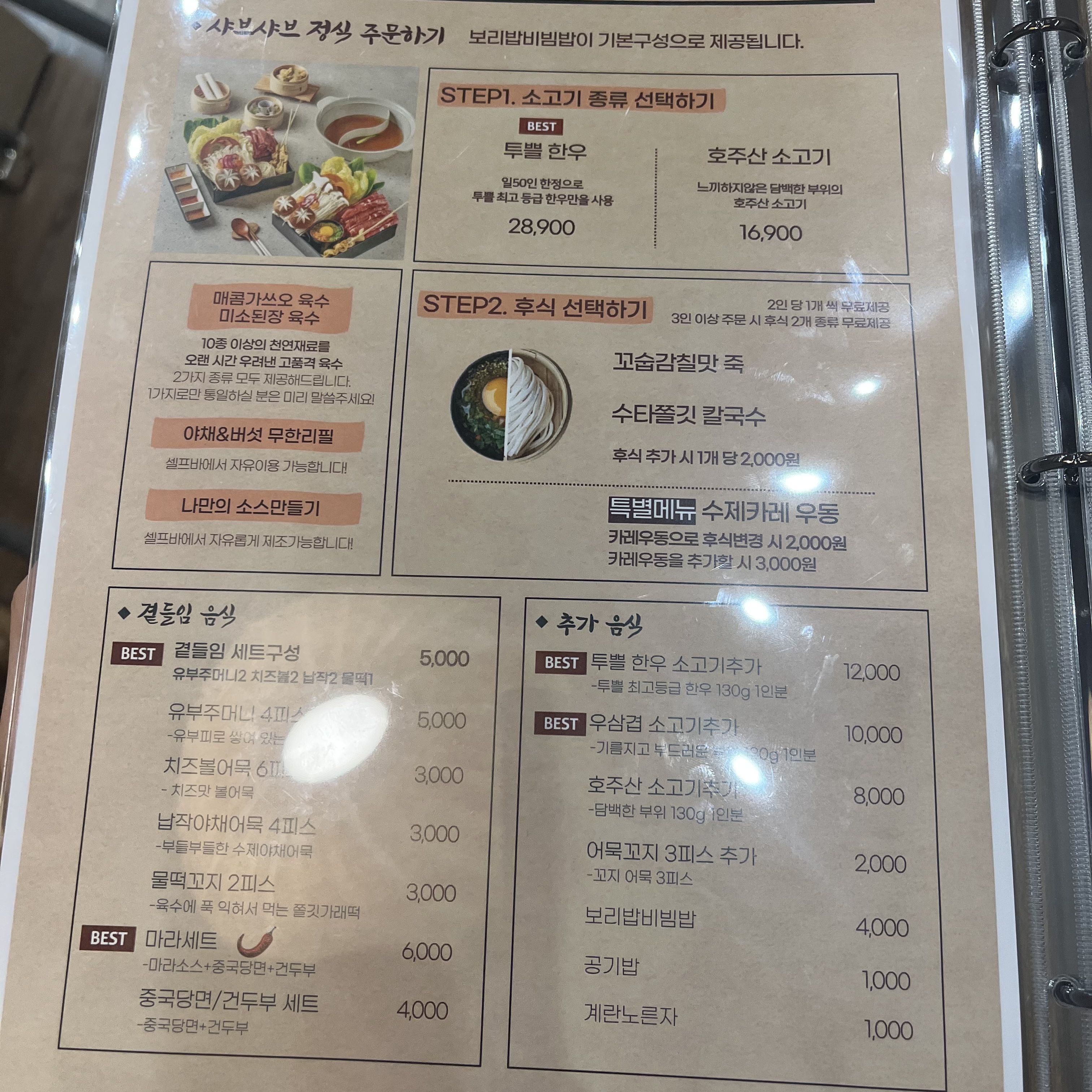 샤브샤브 주문은 고기와 후식을 선택하면 되고, 육수는 매콤가쓰오 & 미소된장 두 가지로 나와요.
