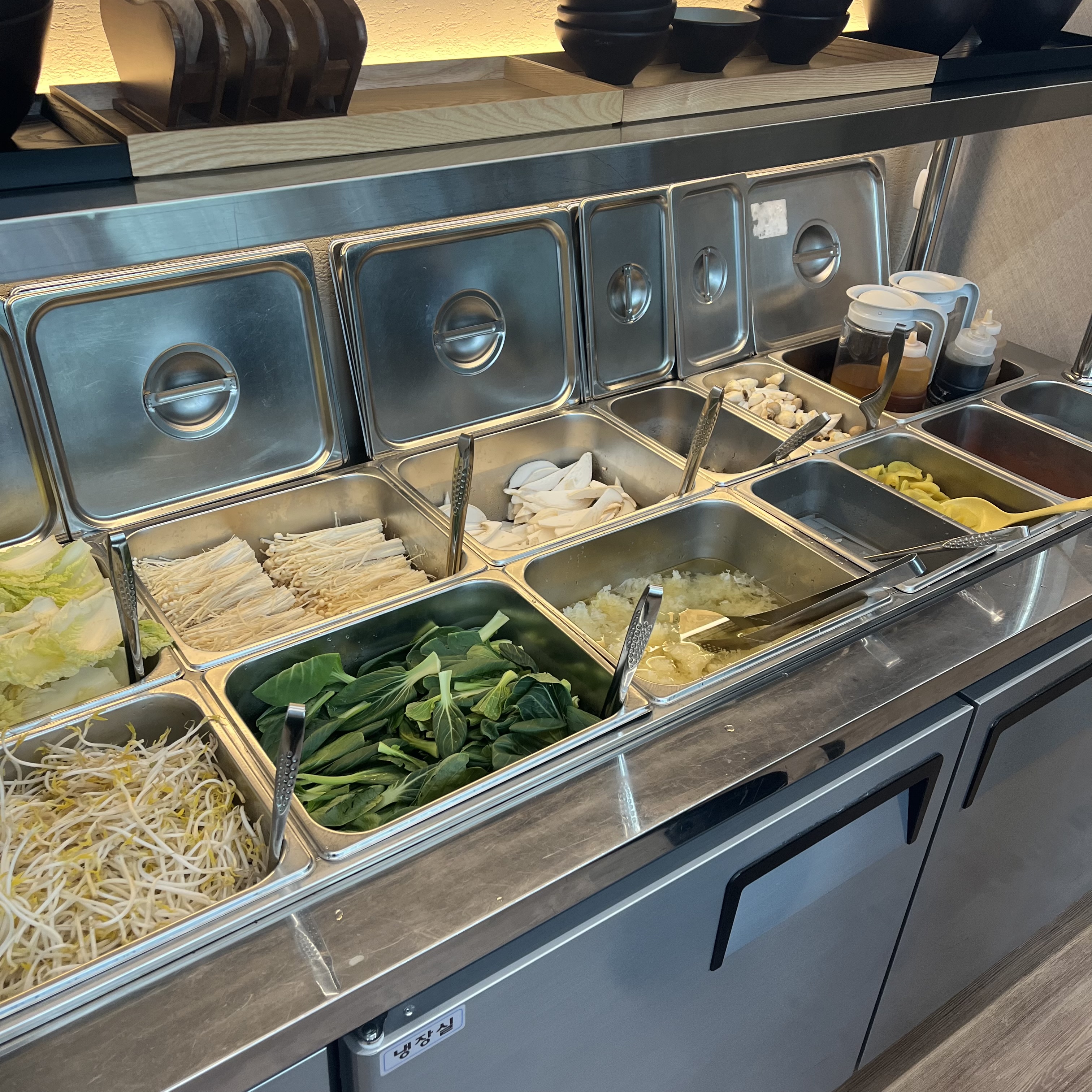 홀 한 쪽에는 셀프바가 있어서 야채, 버섯, 사리들을 무한으로 즐길 수 있습니다.