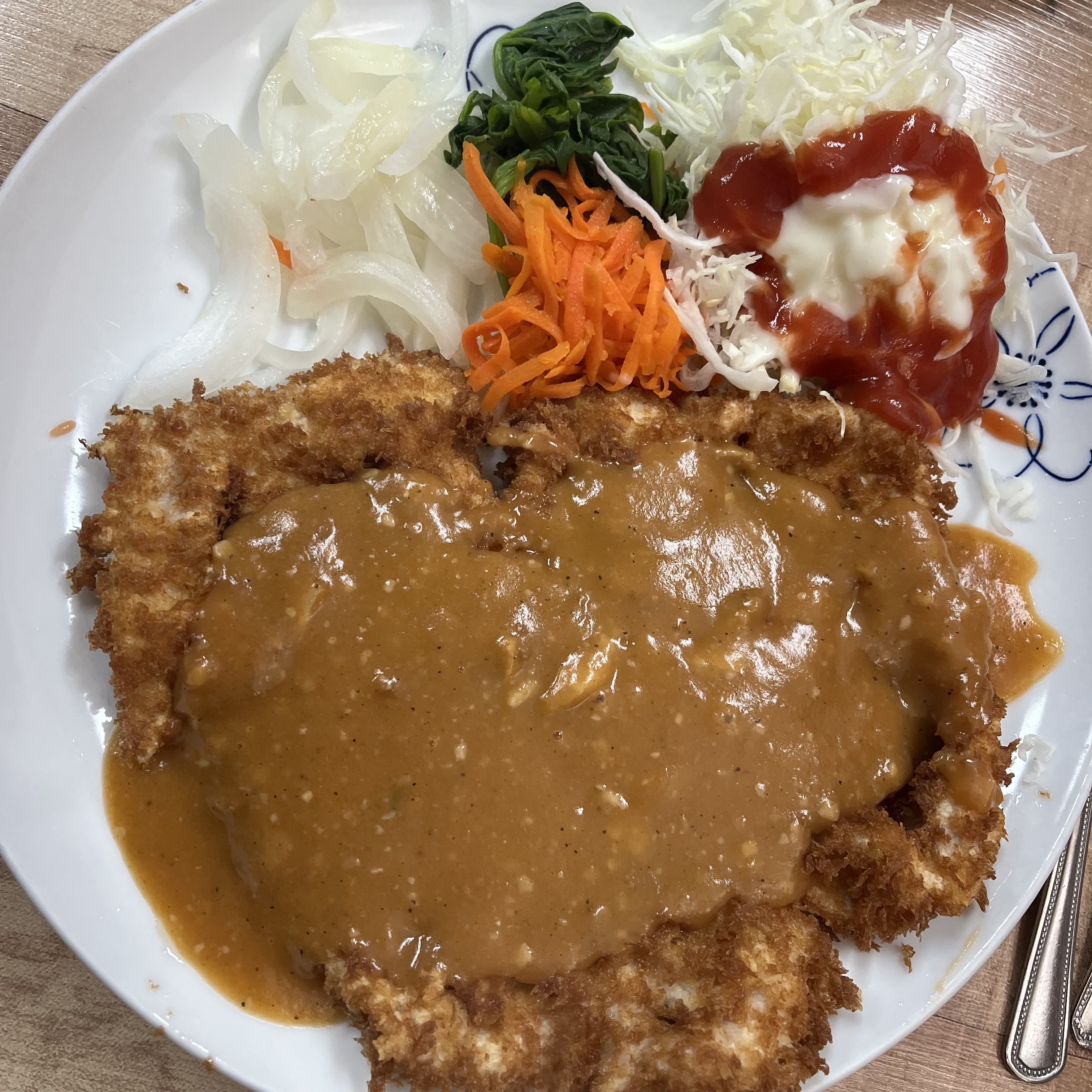 스프에는 후추를 톡톡! 돈까스 튀김은 적당히 바삭하고, 소스는 많이 달지 않고, 건강한 느낌이 나는 돈까스였습니다