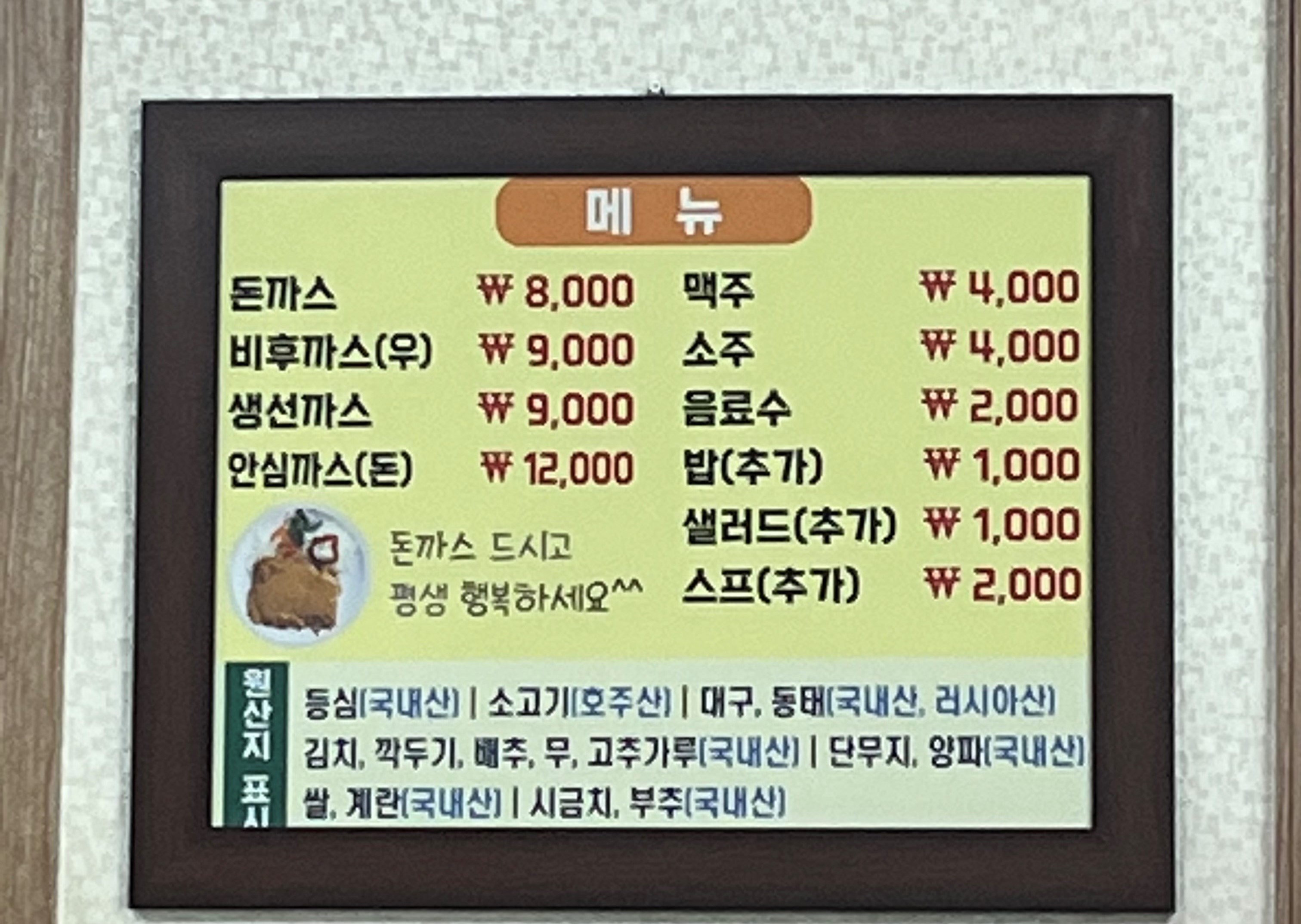 메뉴는 돈까스/비후까스/생선까스/안심까스 이렇게 있는데요