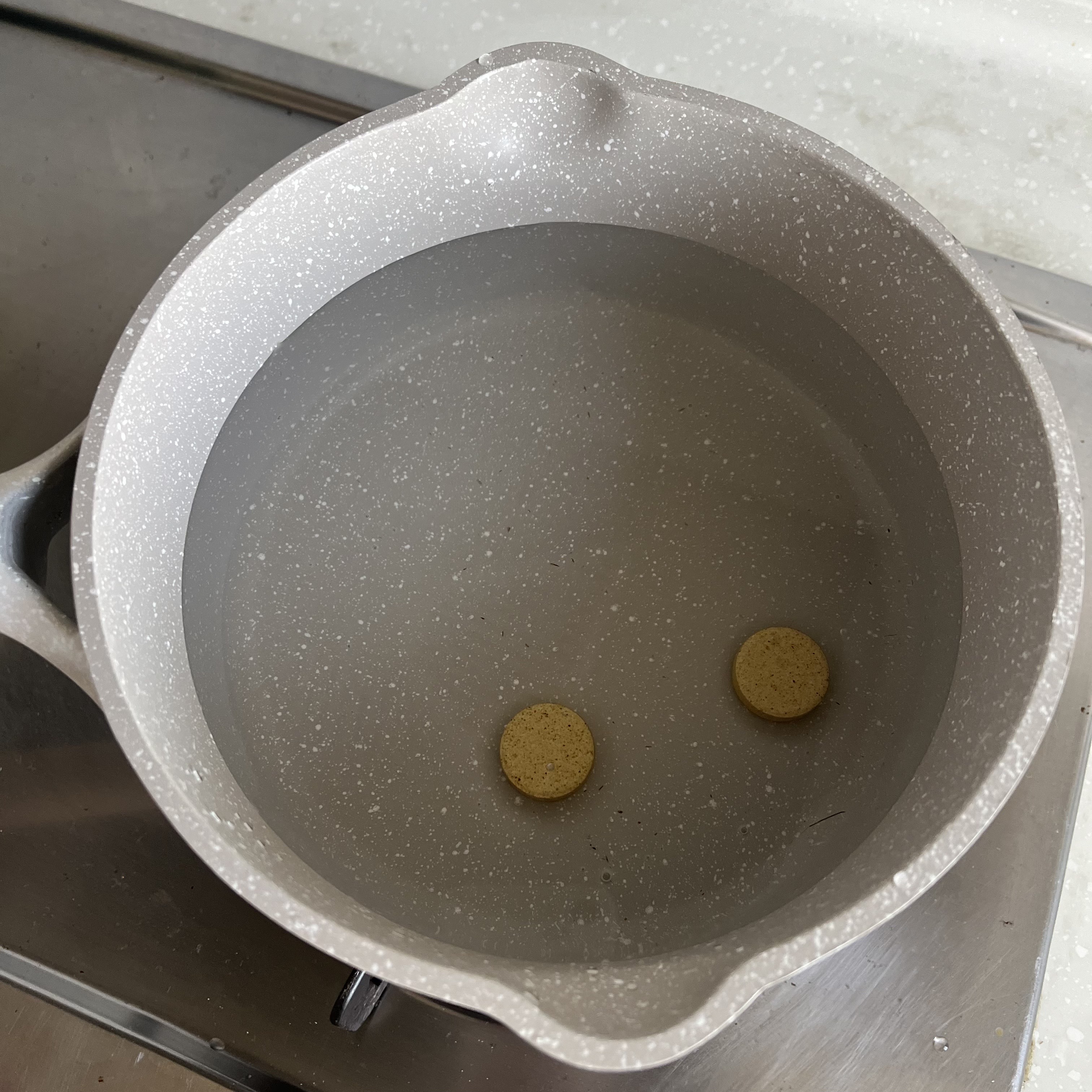 1. 멸치육수를 내줍니다. 간편하게 코인육수 2알 이용했어요.