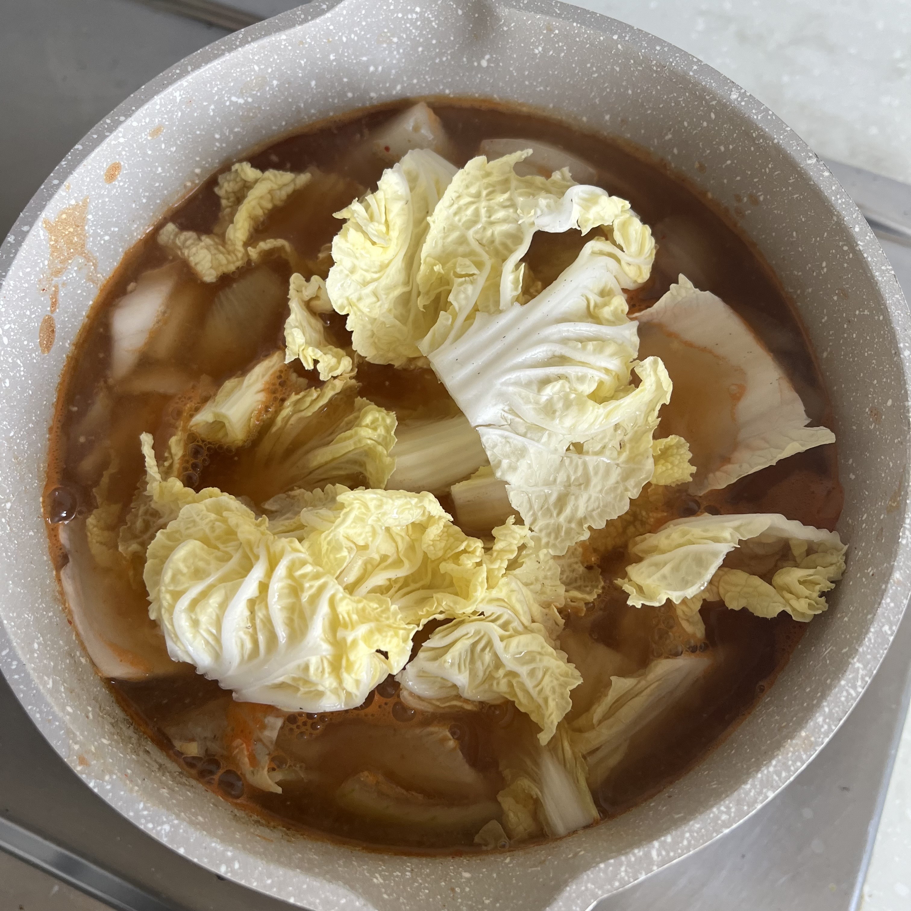 멸치육수 1L, 된장 1T, 고추장 1/3T, 고춧가루 1/3T, 다진마늘 0.5T, 참치액 0.5T(생략가능), 알배추, 양파, 청양고추(기호에 따라)