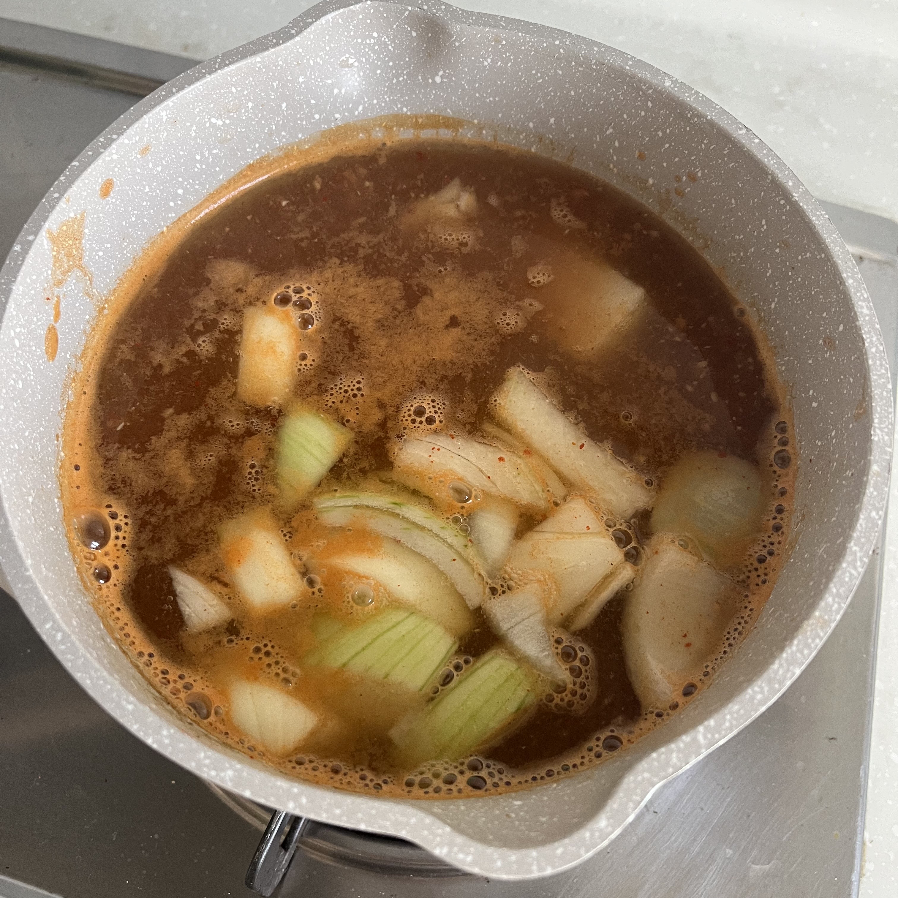3. 육수가 끓으면 된장 1T, 고추장 1/3T, 고춧가루 1/3T, 다진마늘 0.5T, 참치액 0.5T(생략가능)를 넣어주세요.