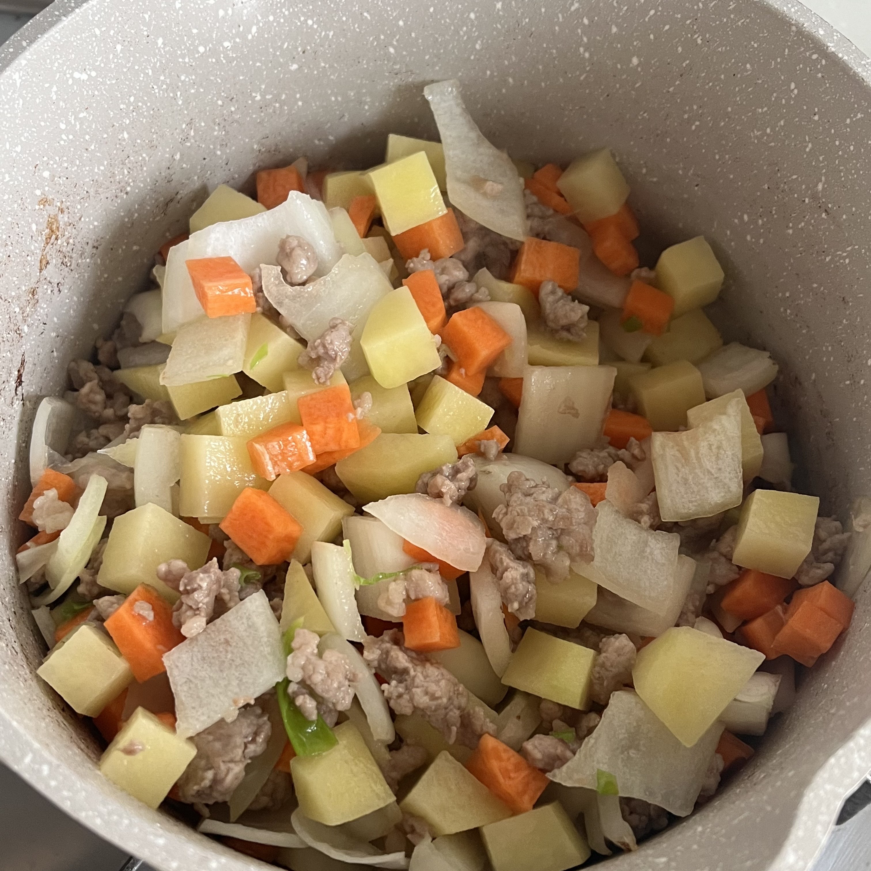 돼지고기의 겉면이 익으면 양파, 감자, 당근, 다진마늘을 넣고 볶아줍니다