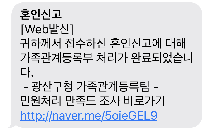 혼인신고서를 접수할때 직원분이 2-3일정도 소요된다고 했는데 바로 다음날 처리가 완료됬다는 문자가 왔습니다